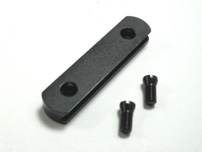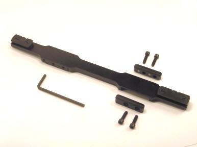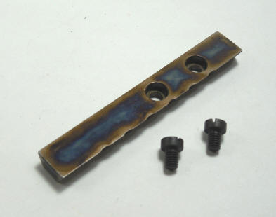 Clamp-on scope rail This rail clamps onto the dovetail found on many European target rifles, making it possible to mount an American-type scope without the need to drill holes. The rail and clamps are black-anodized aluminum; the blocks are black-finished steel. Price: $121.00 with socket-head screws; $137.50 with the "nice" slotted-head screws. Plus shipping. Now available - the unfinished steel version, for engraving and/or color-casing. Black-finished steel clamps. $165.00 w/socket head, $181.50 w/slotted head. |