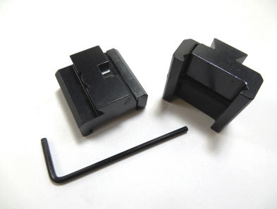 Offset mounts These mounts are for shooting right-handed but left-eyed. They clamp onto standard scope blocks on the barrel. They are available in three offset distances: 2.25", 2.50", or 2.75". The mount is black-anodized aluminum, the block is blackened steel, and the clamping knob is color-case hardened. Price: $137.50 per set plus shipping. |